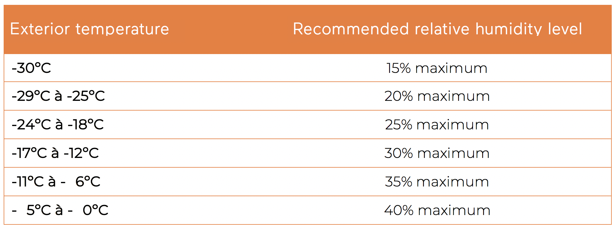 Simply reduce it according to the outside temperature as indicated in the table below (make sure the indoor humidity level does not exceed 50%). To facilitate this process, we recommend getting a good quality hygrometer. This tool measures the humidity level in your house.